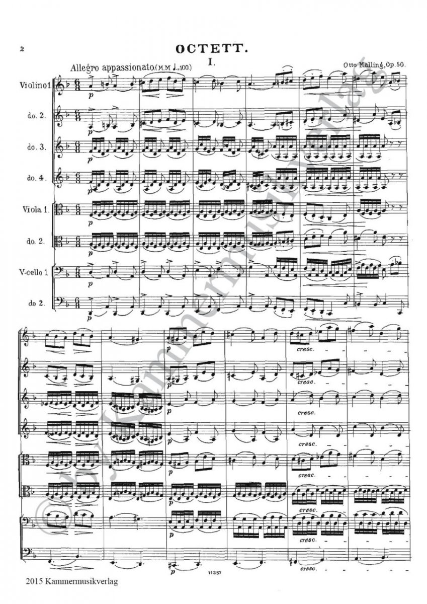 Das Oktett für Streicher op. 50 von Otto Valdemar Malling ist ein bedeutendes spätromantisches Kammermusikwerk des dänischen Komponisten, entstanden um die Wende zum 20. Jahrhundert. Es ist für ein Streichensemble aus vier Violinen, zwei Bratschen und zwei Violoncelli geschrieben und zeichnet sich durch reiche Harmonik, kontrapunktische Texturen sowie dynamische und expressive Kontraste aus. Das Werk verbindet klassische Formen mit einer individuellen nordischen Klangsprache und spiegelt Mallings Einflüsse aus der deutschen Romantik wider. Innerhalb seines Gesamtwerks stellt das Oktett eine seiner größten kammermusikalischen Kompositionen dar und wird heute als wichtiger Beitrag zur skandinavischen Musiktradition gewürdigt, wenngleich es international weniger bekannt ist.