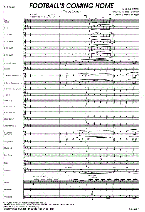 Zusatzinfo/Inhalt 'Three Lions' war der offizielle Song der englischen Fußball-Nationalmannschaft für die Europameisterschaft 1996. Seither gehört dieser Titel zum Standard-Repertoire singender Fangruppen. Im Refrain hört man 'it's coming home, football's coming home”. Heinz Briegel hat aus diesem Song ein begeisterndes Blasorchester-Arrangement gemacht, das echtes Stadion-Feeling verbreitet.