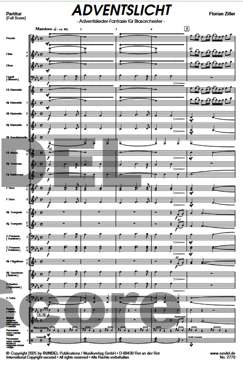 Zusatzinfo/Inhalt Der Advent ist eine besonders stille Zeit im Jahr. Er gibt uns Raum zur Besinnung und zur inneren Einkehr. Außerdem lehrt er uns, die aus den langen Winternächten resultierende Dunkelheit anzunehmen und auf das Gute zu hoffen. Adventslichter (bspw. auf dem Adventskranz) gelten als Symbol der Vorfreude auf die Ankunft des Herrn. Das Entzünden der Kerzen erinnert uns daran, uns nicht der Dunkelheit hinzugeben, sondern im Leben aktiv nach Licht und Trost zu suchen. Mit seiner Adventslieder-Fantasie, in der die drei bekannten Adventslieder „Morgenglanz der Ewigkeit“, „Wie schön leuchtet der Morgenstern“ und „Was soll das bedeuten“ verarbeitet sind, lädt uns der Komponist Florian Ziller zu einer musikalischen Meditation ein. Sie beginnt mit einer strahlend-feierlichen, auf dem Anfangsmotiv von „Was soll das bedeuten“ basierenden Einleitung im Tutti, bevor das erste Thema „Morgenglanz der Ewigkeit“ vorgestellt wird. Es wird zunächst kammermusikalisch-zart in den Holzbläsern eingeführt und anschließend im Tenorhorn/Bariton in Form einer Cantilene variiert. „Wie schön leuchtet der Morgenstern“ präsentiert sich zunächst als heiterer Tanz im Alla Breve, um dann als andächtiger Choral weitergeführt zu werden. „Was soll das bedeuten“ wird schließlich – analog zum ersten Lied – ebenfalls zunächst kammermusikalisch (in Altsaxophon und Flügelhorn) vorgestellt, bevor die einleitenden Takte der Komposition als Reprise aufgegriffen werden und das Werk in einen prachtvollen Schluss führen. Mit ADVENTSLICHT hat Florian Ziller das Blasorchester-Repertoire für die Advents- und Weihnachtszeit um ein herausragendes Werk bereichert. Es wird jedes Konzert auf besonders stimmungsvolle Art und Weise erhellen.