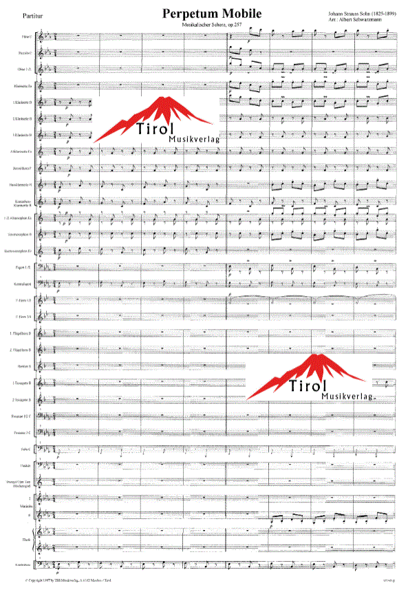 Zusatzinfo/Inhalt Das Perpetuum Mobile op. 257 von Johann Strauss Sohn (1861) ist ein musikalischer Scherz, der auf einem ostinaten Bassgerüst basiert und die Wiener Ballkultur des 19. Jahrhunderts widerspiegelt. Ursprünglich für Orchester komponiert, wurde das Werk durch Bearbeitungen für Blasorchester populär, insbesondere durch die Adaption von Albert Schwarzmann. Seine Bearbeitung passt das Werk klanglich und spieltechnisch an Blasorchester an, bewahrt jedoch den humorvollen Charakter des Originals. Schwarzmanns Version trug maßgeblich zur Verbreitung des Stücks in der Blasmusikszene bei und zeigt, wie klassische Kompositionen durch Bearbeitungen neue Hörerschichten erreichen können.